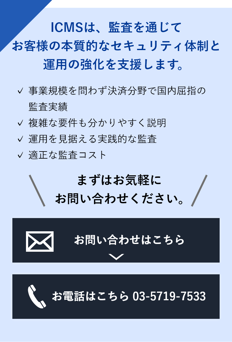 2015年にPCI DSSへ初準拠するまでの数年間、社内プロジェクトを通じて準備を進める中で、ICMS様には都度確認・指導をいただきました。その信頼と豊富な監査実績から、準拠監査をお願いすることを決定しました。適切なアドバイスに加え、同じ品川区に拠点を構えることで迅速な対応もいただき、心強いパートナーとして良好な関係を築けています。
